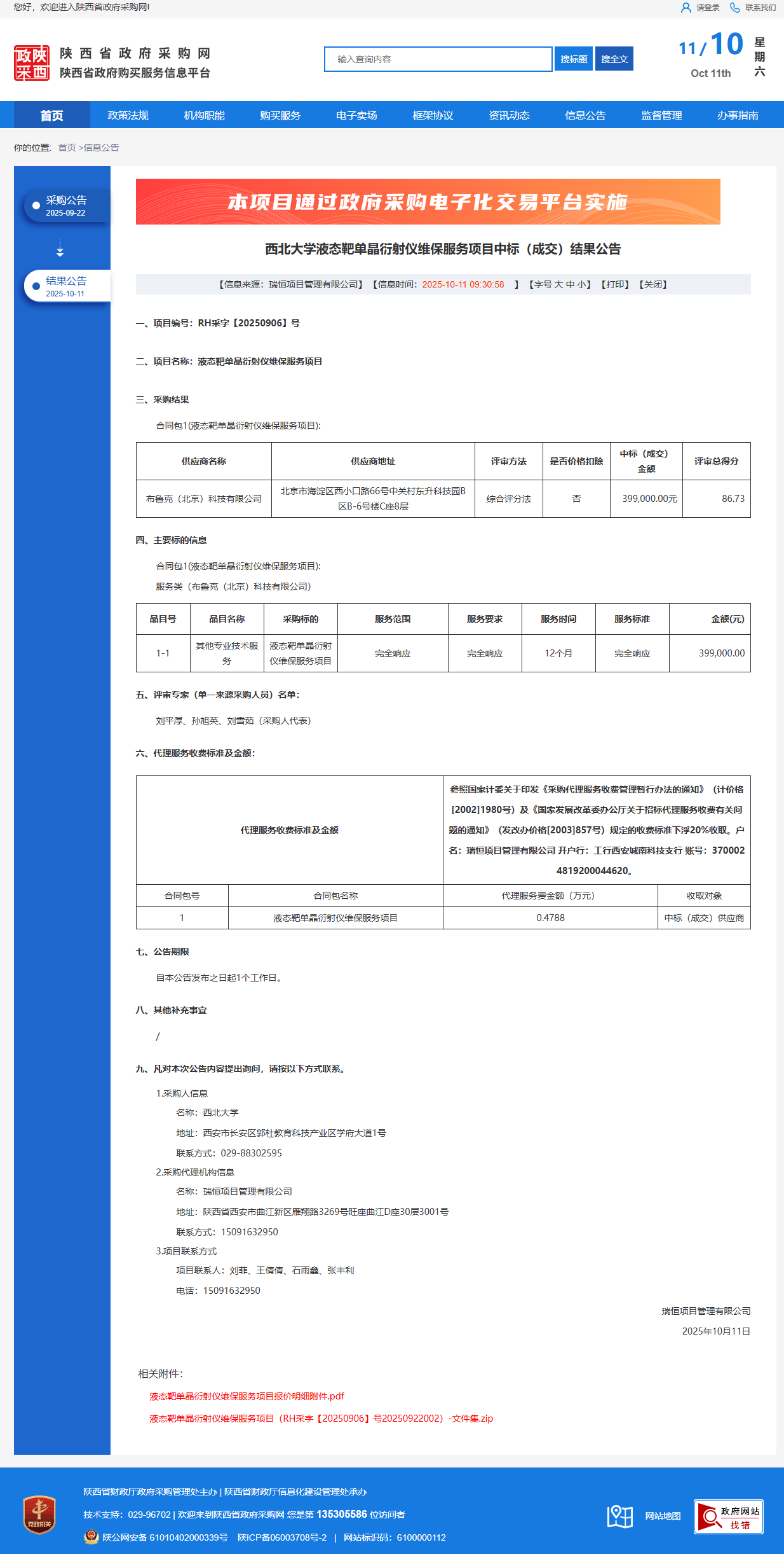 古天乐代言太阳集团城网址液态靶单晶衍射仪维保服务项目中标(成交)结果公告