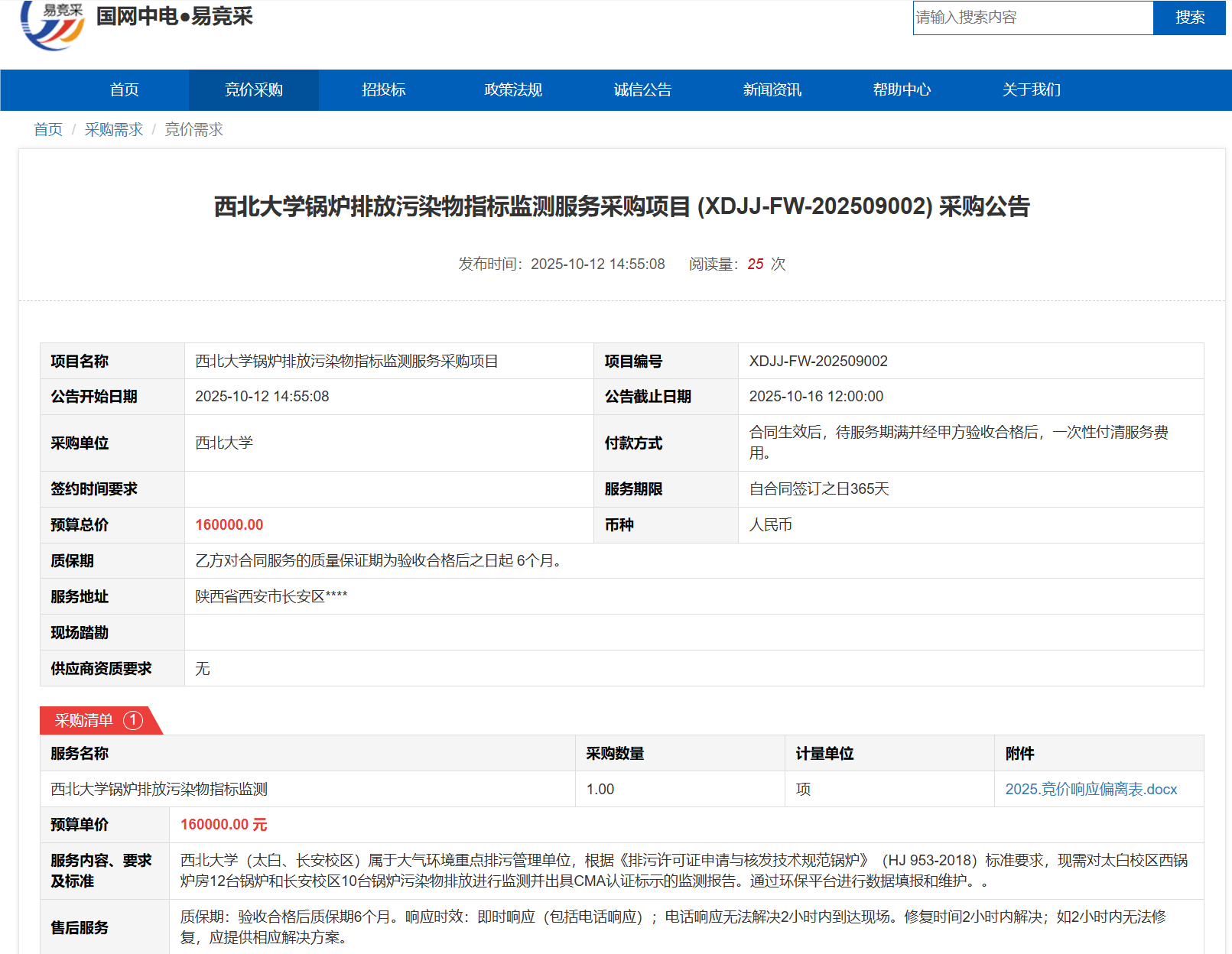 古天乐代言太阳集团城网址锅炉排放污染物指标监测服务采购项目(XDJJ-FW-202509002)竞价采购公告