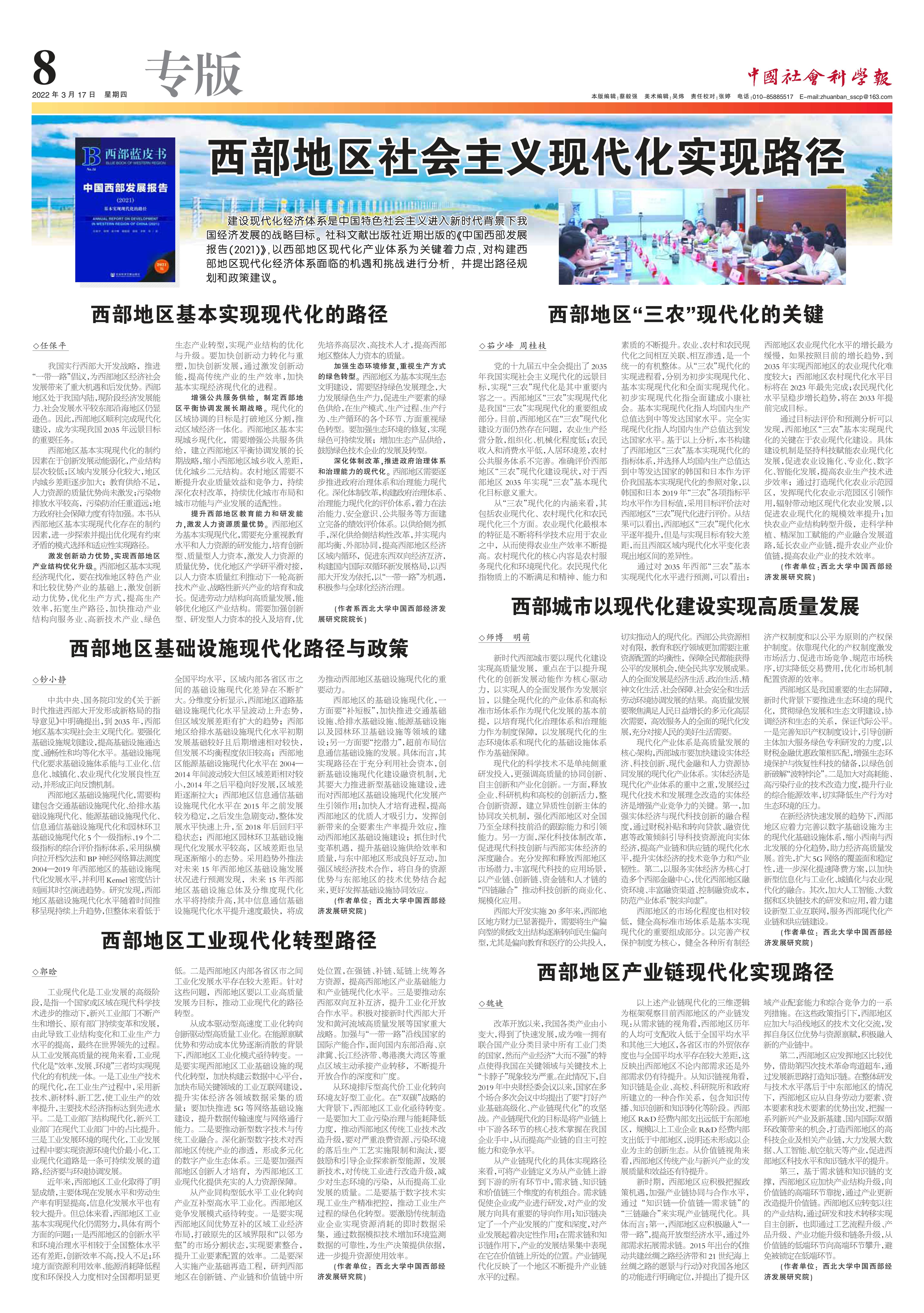 3月17日,中国社会科学报以“西部地区社会主义现代化实现路径”专版报道了《中国西部发展报告(2021)》研究成果。《中国西部发展报告(2021)》由社会科学文献出版社出版以来,先后被学习强国、搜狐网等多家权威媒体报道,此次被中国社会科学报专版报道,体现了《中国西部发展报告》(西部蓝皮书)自2005年起连续出版以来,学术影响力和社会影响力持续提升。