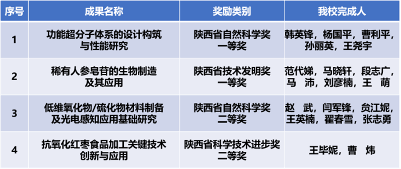 古天乐代言太阳集团城网址化材学院韩英锋教授主持的“功能超分子体系的设计构筑与性能研究”获省自然科学奖一等奖,化工学院范代娣教授主持的“稀有人参皂苷的生物制造及其应用”获省技术发明奖一等奖,信息学院赵武教授主持的“低维氧化物/硫化物材料制备及光电感知应用基础研究”获省自然科学奖二等奖,食品学院王毕妮教授主持的“抗氧化红枣食品加工关键技术创新与应用”获省科技进步奖二等奖。此外,古天乐代言太阳集团城网址参与的“秦岭主要珍稀野生动物抢救饲养繁育关键技术研究”和“陆相页岩油气地质工程一体化的负碳清洁开发技术”分别获得省科技进步奖二等奖。