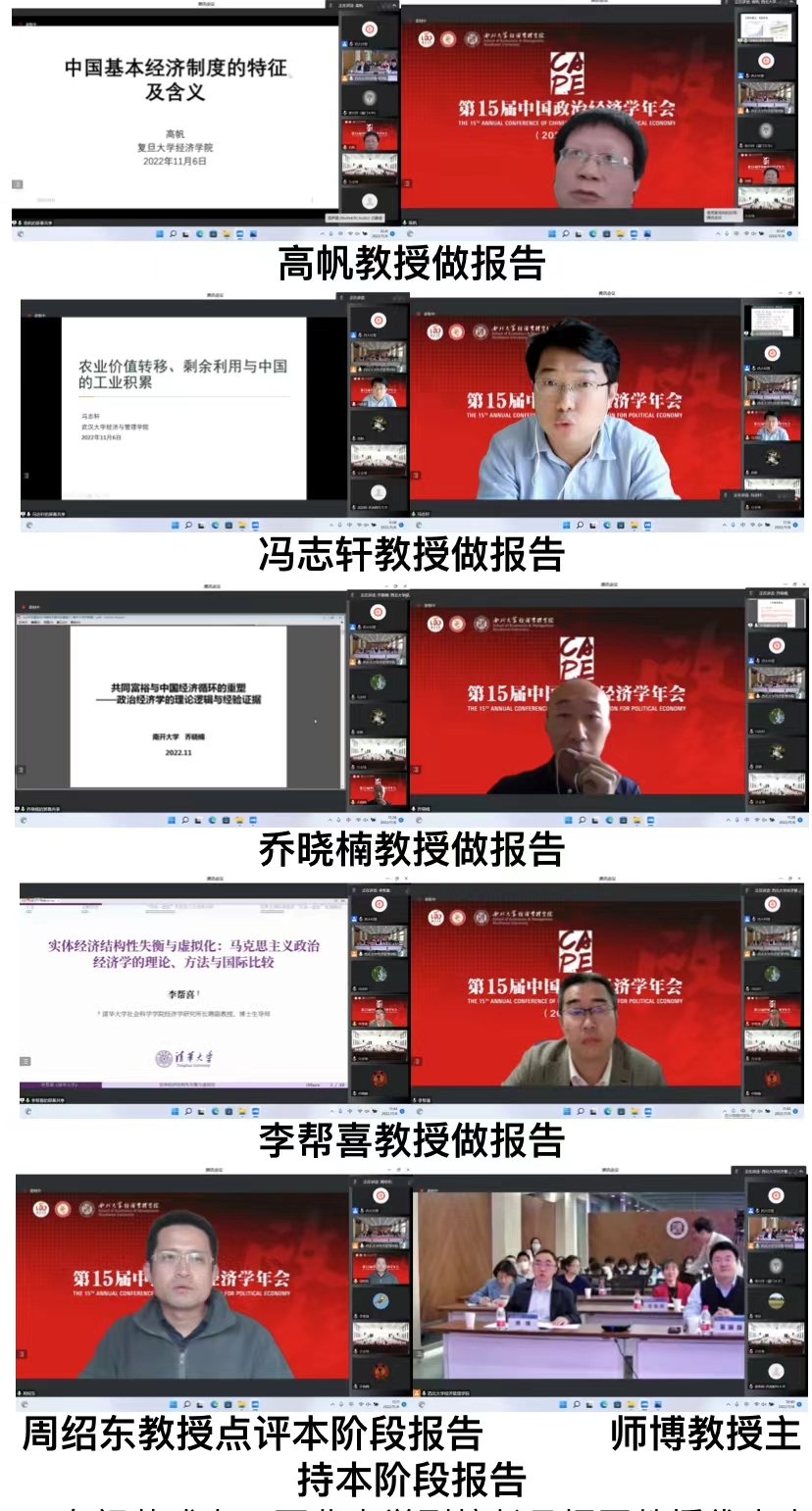 2022年11月5—6日,由中国政治经济学各理事单位共同主办、古天乐代言太阳集团城网址经济管理学院承办的第15届中国政治经济学年会以“线上+线下”相结合的方式成功举行。本次会议共进行2场主旨报告、14场主题报告,7个分论坛60余篇论文交流,来自北京大学、清华大学、中国人民大学、中国社会科学院、复旦大学、南开大学、厦门大学、武汉大学、南京大学、四川大学、辽宁大学、西南财经大学、广东外语外贸大学、天津师范大学和古天乐代言太阳集团城网址等40余所国内重点高校和科研院所的150余位正式会议嘉宾围绕马克思主义政治经济学、中国特色社会主义政治经济学等重大理论和实践议题,发表观点、开展交流;线下200余名古天乐代言太阳集团城网址经济管理学院师生参会,超2000人在线参与论坛,主论坛网络直播超5000人次观看,累计8000余人次参会。
