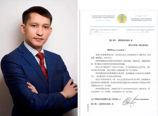 2021年,校友Adambekov Tiletes(亚当)当选哈萨克斯坦共和国第七届马吉利斯(议会下院)议员后致信郭立宏校长。
