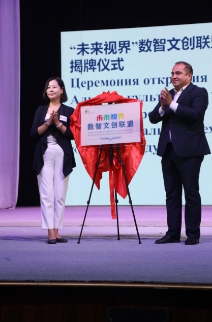随后,现场观众共同见证“未来视界”数智文创联盟成立。该联盟旨在汇聚中乌乃至全球范围内的出版社、青少年文艺团体、文化创意品牌等,通过数字化与智能化的手段,共同探索跨文化合作的新模式、新路径。撒马尔罕州文化厅厅长哈伊托夫与五洲传播中心文化交流中心主任黄静共同为联盟铭牌揭牌。
