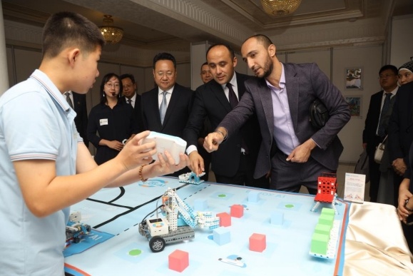 活动伊始,到场嘉宾共同参观了“未来世界”国际青少年艺术作品展和“未来视界”数智文创展。本次艺术作品展汇聚了中国、乌兹别克斯坦及全球其他国家逾三百件青少年及青年艺术家的作品,涵盖绘画、书法和工艺美术等多个类别。作品题材多元,涉及科技创新、文化遗产保护与传承、文明多样性与交流互鉴、全球共同议题等主题。年轻的创作者们运用独特的视角、鲜明的色彩描绘内心的无限憧憬与想象,表达出对未来世界的多维探索和深刻思考。