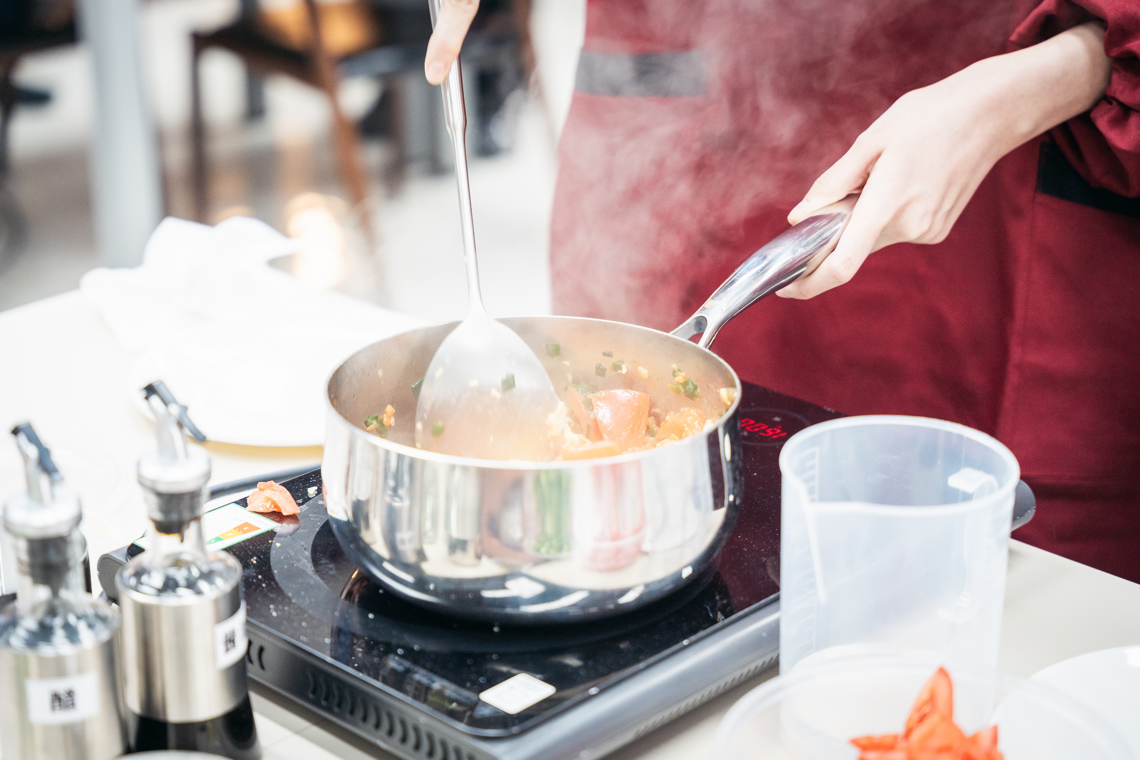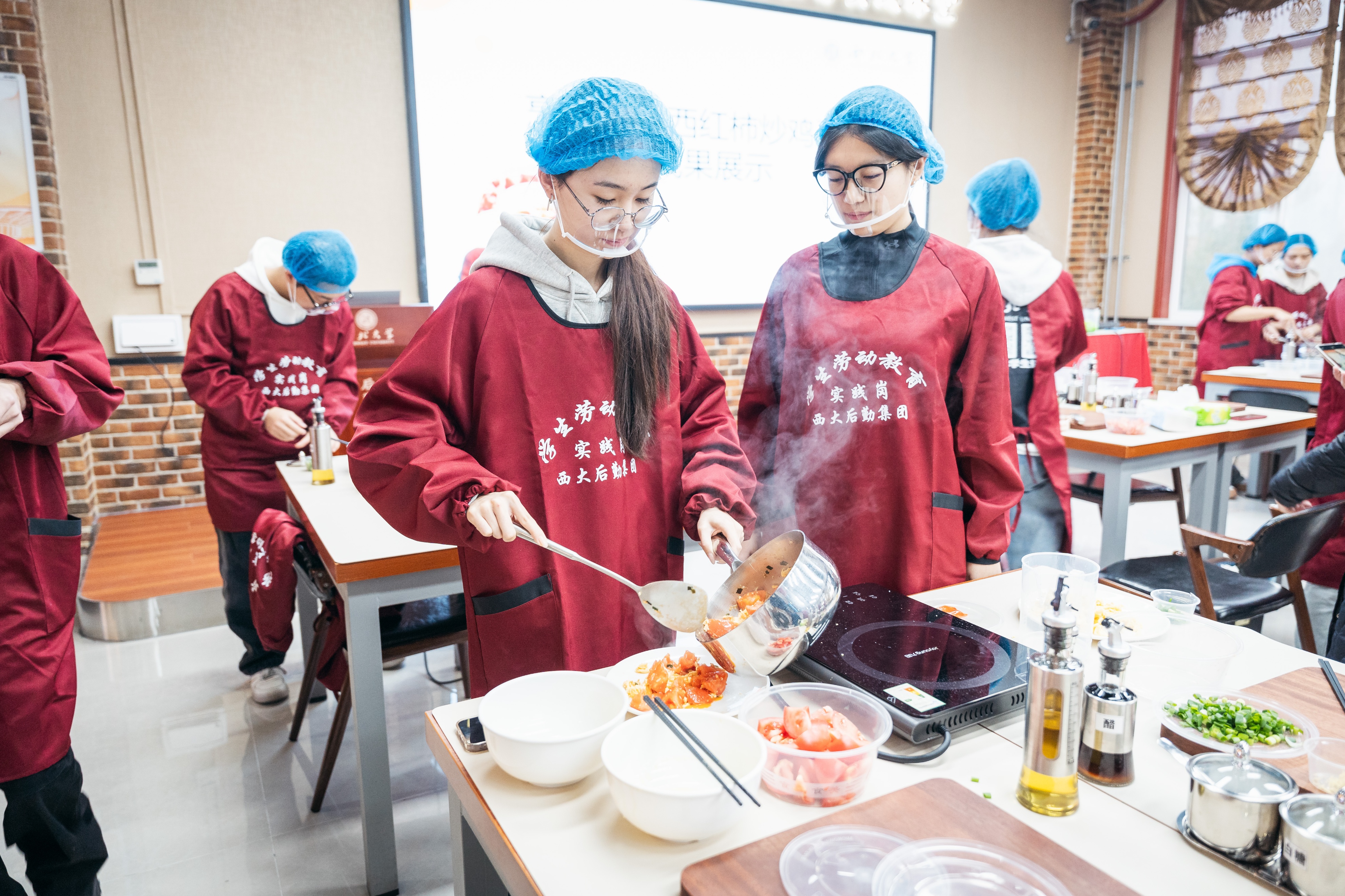 “虽然这只是一道简单的家常菜,但是其中的讲究可不少。”在老师和食堂工作人员的指导下,同学们点火、倒油,加入葱花炝锅,加入打好的鸡蛋和切好的西红柿,翻炒、调味,一套行云流水的动作下来,一盘色香味俱全的西红柿炒鸡蛋新鲜出锅。
