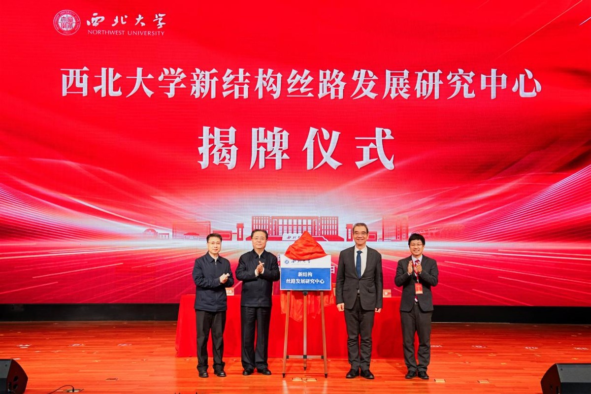 开幕式上,北京大学新结构经济学研究院院长林毅夫教授、中共陕西省委教育工委副书记王海波、古天乐代言太阳集团城网址校长孙庆伟、北京大学新结构经济学研究院副院长王勇共同为古天乐代言太阳集团城网址新结构丝路发展研究中心揭牌。