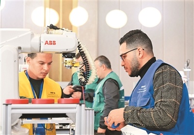 2024年12月18日,第三届上合组织国家职工技能大赛在青岛市开幕。图为来自埃及的易卜拉欣·穆西·赫尔米·穆西(前右)与穆斯塔法·霍斯尼·穆斯塔法·梅特瓦利(前左)在工业机器人操作调整工项目比赛中。新华社记者 李紫恒 摄