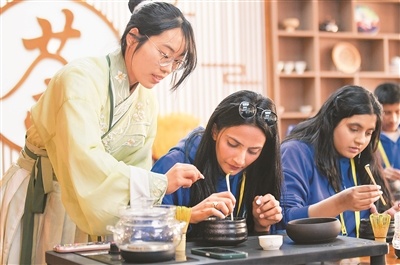 2024年4月15日,2024年“汉语桥”上海合作组织国家青年学生春令营开营仪式在新疆师范大学举行。来自8个上合组织国家的近500名青年学生参加了此次春令营。图为参加春令营的来华青年学生在新疆师范大学学生(左)的指导下学习茶艺。新华社记者 王菲 摄