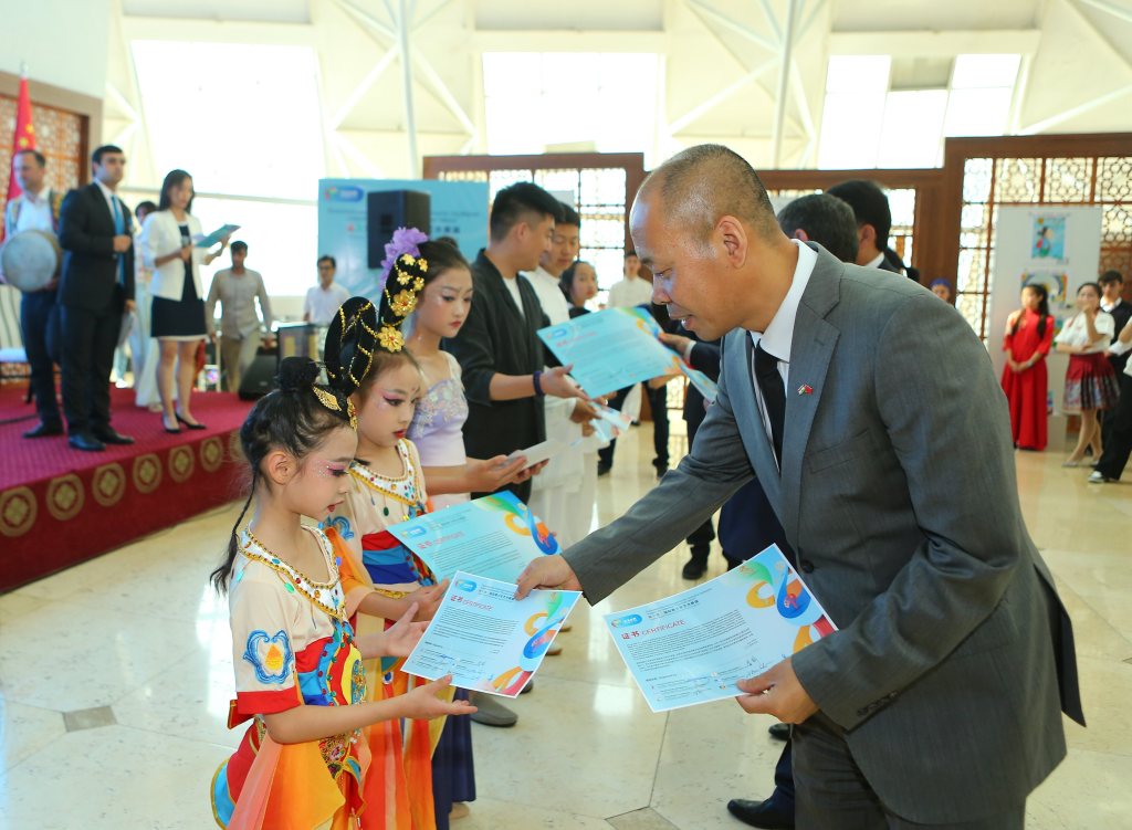 6月27日,2024“未来世界”国际青少年艺术展演在位于杜尚别的塔吉克斯坦国家博物馆举行。图为嘉宾为参加展演的青少年和组织机构颁发证书。