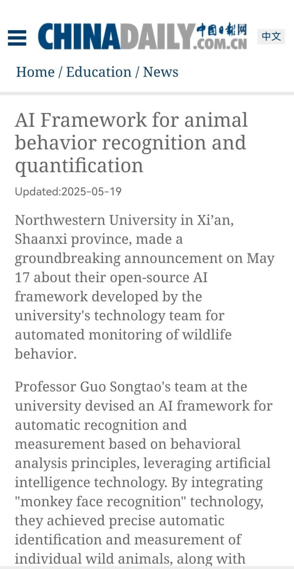 “AI框架就像一位‘翻译官’,让人可以通过算法,在实验室内推断出动物行为背后的含义。”郭松涛说道。为解决行为智能分析中面临的共性难题,团队基于行为学分析原理,从行为的结构分析,利用人工智能技术,设计了自动识别与测量AI框架,融合“猴脸识别”技术,最终实现了可以区分和追踪野生动物个体身份的行为精准自动识别与测量,以及自动汇报行为节律和时间分配结果的行为自动化监测的技术突破。
