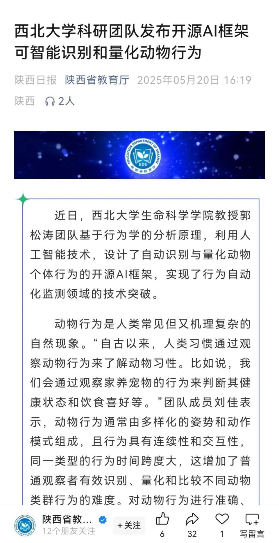 郭松涛表示,该技术可广泛应用于圈养动物日常活动规律监测和关键行为异常预警、野生动物行为数据分析和习性研究、实验动物健康状态和福利监测,甚至对人类自身的行为特征和健康状态进行监测分析。