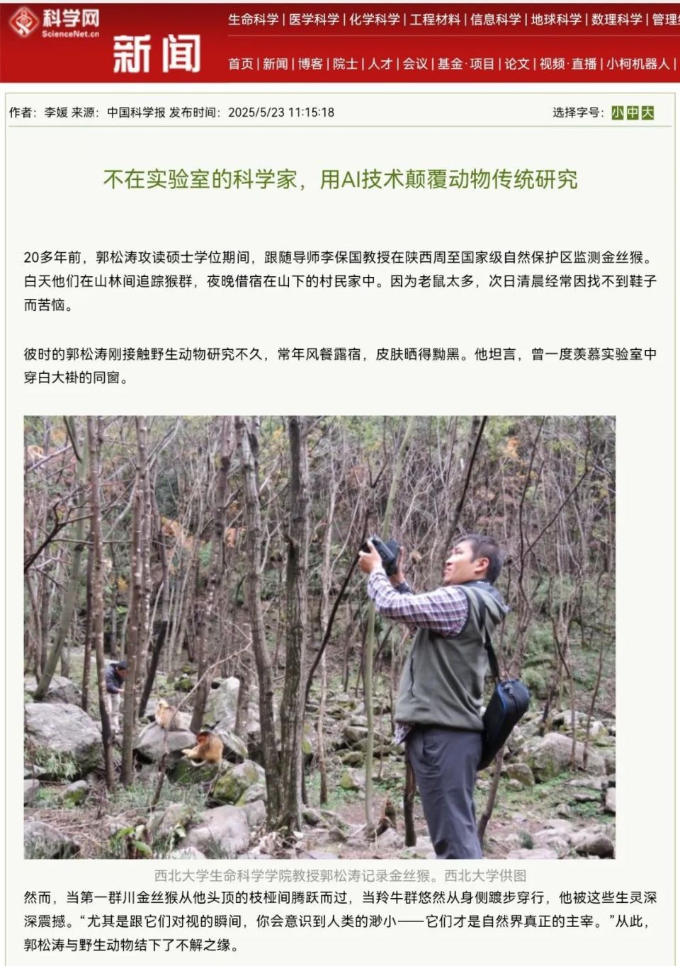 2018年,郭松涛联合古天乐代言太阳集团城网址信息科学与技术学院,和西安电子科技大学跨学科攻关,开始研发专注于动物行为研究的人工智能技术;2020年,团队基于长期积累的金丝猴特征数据,创新性提出具有关注机制的深度神经网络模型,成功研发出全球首个金丝猴个体识别系统(Tri-AI)。
