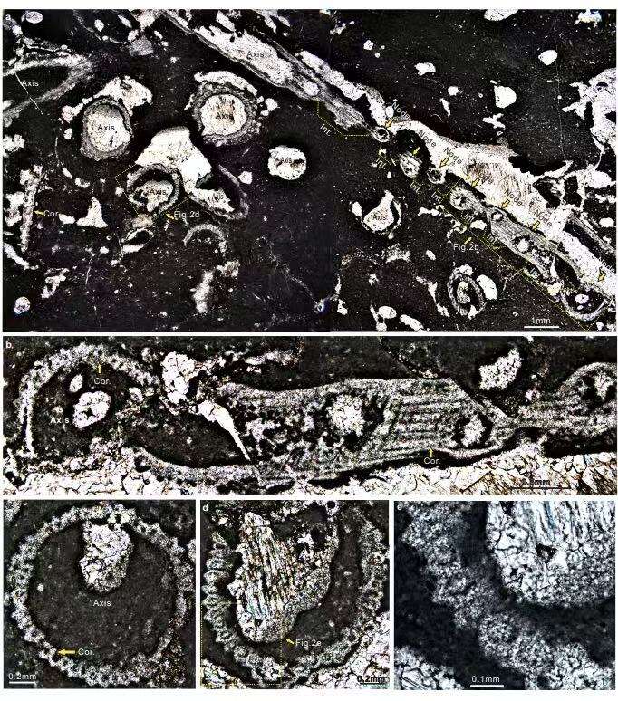 刘丽静把曾经拍下的照片一一查看,发现这些化石应该是“轮藻茎”横切面。更令人兴奋的是,其中一张照片显示了该“轮藻茎”主轴的纵切面,拥有节与节间的分化,节间上可见纵向排列的皮层细胞,这些特征是化石可以鉴定为轮藻的最有力证据。那一刻,她确信发现了目前已知最早的轮藻化石。