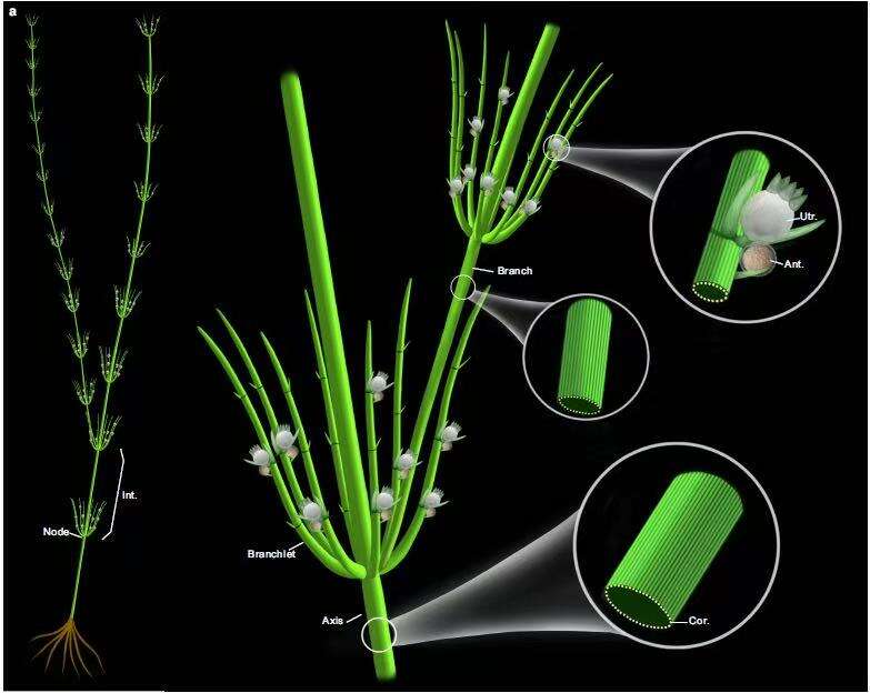 让人惊讶的是,该化石主轴上有轮生小枝,且有节与节间分化,节间上覆盖有纵向排列的皮层细胞,并且小枝也具有皮层细胞。此外,还发现了稀少的可能是覆盖藏卵器的外壳化石。它们的叶状体和现生的轮藻非常接近,表明轮藻叶状体演化非常保守。同时,由于其皮层细胞更多,缺乏复杂的外壳和钙化藏卵器等特征,所以推断是轮藻纲的基干类群。根据红藻门、绿藻门、轮藻门中6个纲,以及陆地植物各门类共13个类群62个性状特征的系统发育分析,研究团队进一步确认了陆地植物与轮藻门的演化关系。