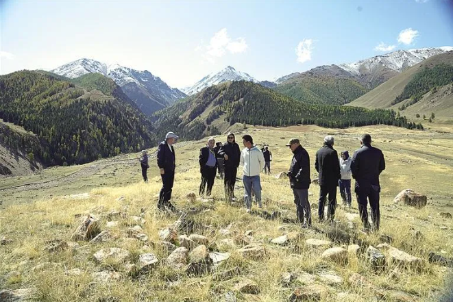 中亚考古学者考察巴里坤哈萨克自治县红山口遗址(资料照片)。
