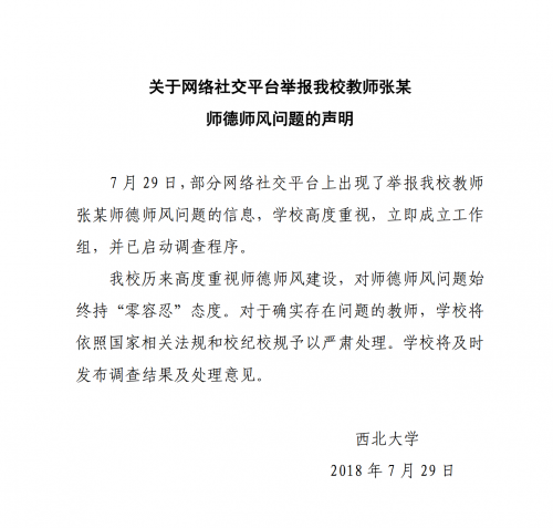 关于网络社交平台举报太阳集团城教师张某师德师风问题的声明