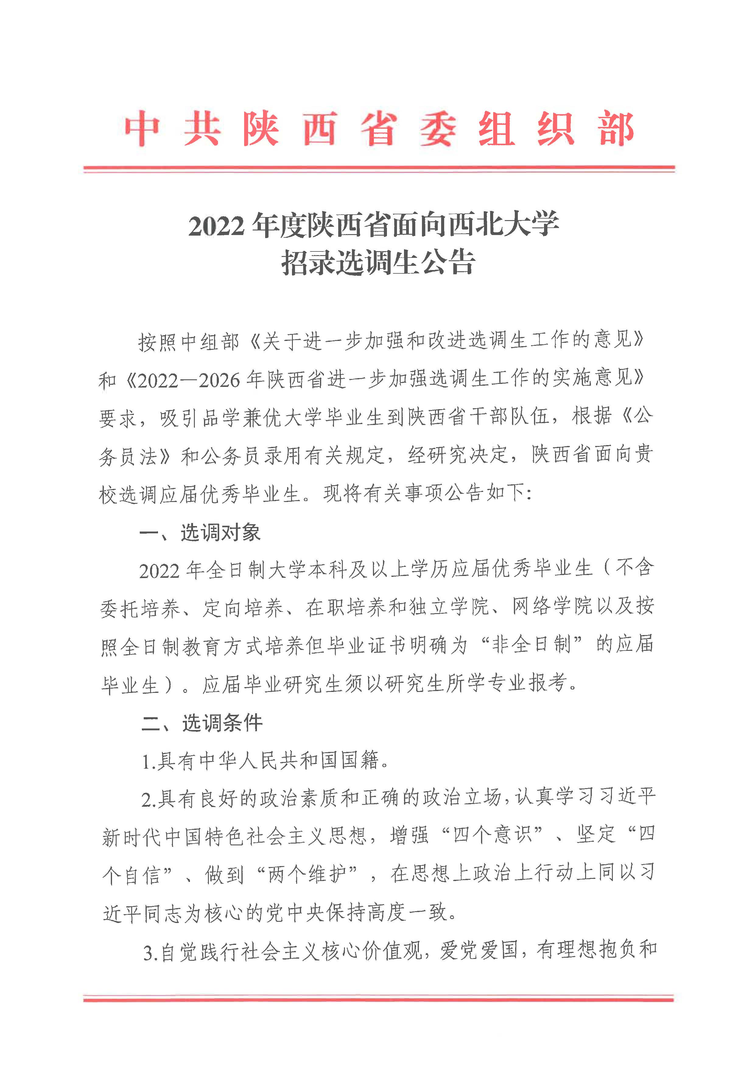 2022年度陕西省面向古天乐代言太阳集团城网址招录选调生公告