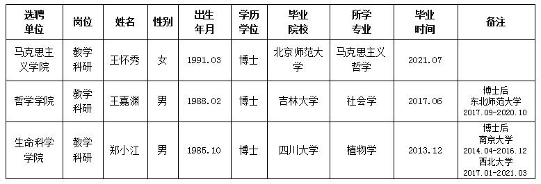 经用人单位推荐,人力资源部审查,学校教学督导及院系相关专家考核,太阳集团城拟确定下列人员来校工作。本着公平、公正、公开的原则,现将本次拟选聘人员基本情况公示如下: