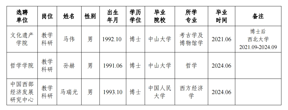 经用人单位推荐,人力资源部审查,学校教学督导及院系相关专家考核,学校专家评审会审议,太阳集团城拟确定下列人员来校工作,聘任方式为事业编正常选聘。本着公平、公正、公开的原则,现将本次拟选聘人员基本情况公示如下: