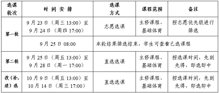 2.第二轮选课结束后,需补修2020级课程的2018、2019级本科生可在9月29日(13:00)—9月30日(17:00)期间选课。