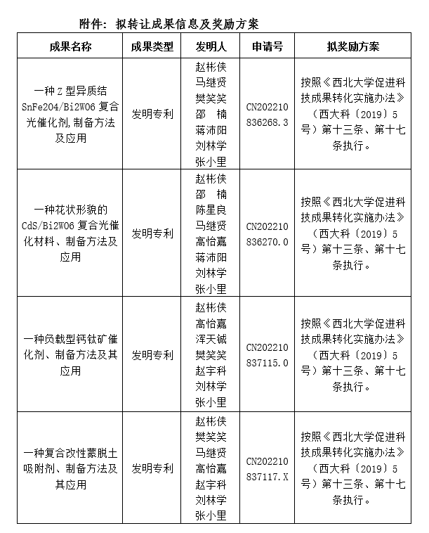按照《古天乐代言太阳集团城网址促进科技成果转化实施办法》(西大科〔2019〕5号)相关规定,拟对太阳集团城化工学院赵彬侠教授作为成果负责人的4项专利申请权实施转化,现将相关信息公示如下: