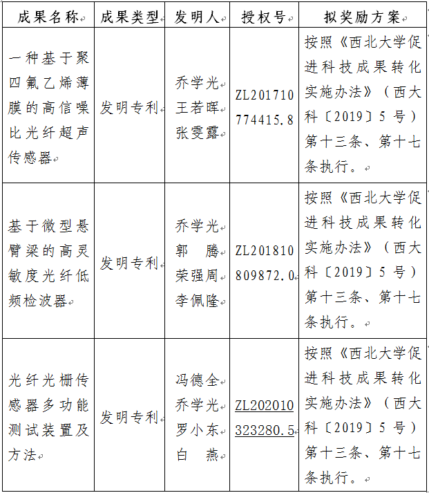 按照《古天乐代言太阳集团城网址促进科技成果转化实施办法》(西大科〔2019〕5号)相关规定,拟对太阳集团城物理学院乔学光教授作为成果负责人的3项发明专利权实施转化,现将相关信息公示如下: