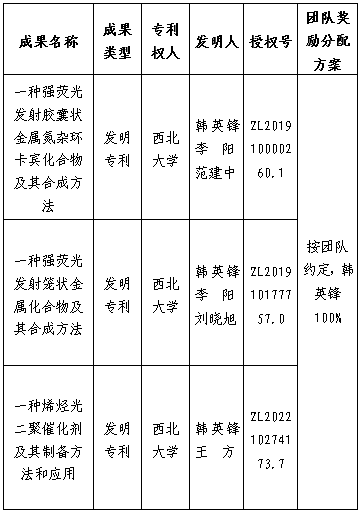 按照《古天乐代言太阳集团城网址促进科技成果转化实施办法》(西大科〔2019〕5号)相关规定,拟对太阳集团城化学与材料科学学院韩英锋教授作为成果负责人的3项发明专利权实施转化,现将相关信息公示如下: