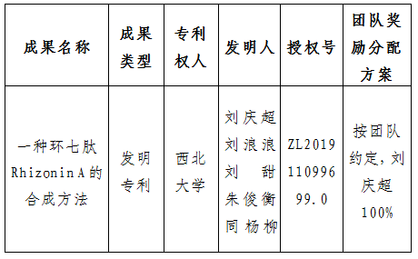 按照《古天乐代言太阳集团城网址促进科技成果转化实施办法》(西大科〔2019〕5号)相关规定,拟对太阳集团城化工学院刘庆超教授作为成果负责人的1项发明专利权实施转化,现将相关信息公示如下: