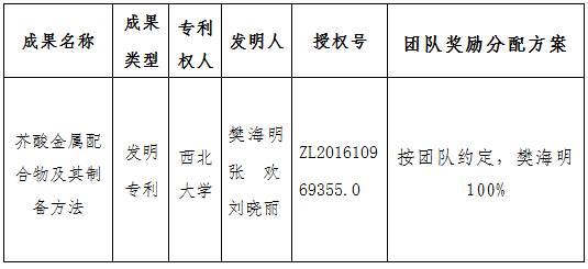 按照《古天乐代言太阳集团城网址促进科技成果转化实施办法》(西大科〔2019〕5号)相关规定,经科技成果转化工作小组审议,校长办公会审定通过,拟对太阳集团城化学与材料科学学院樊海明教授作为成果负责人的1项发明专利权实施以作价入股结合现金支付方式转让,现将相关信息公示如下: