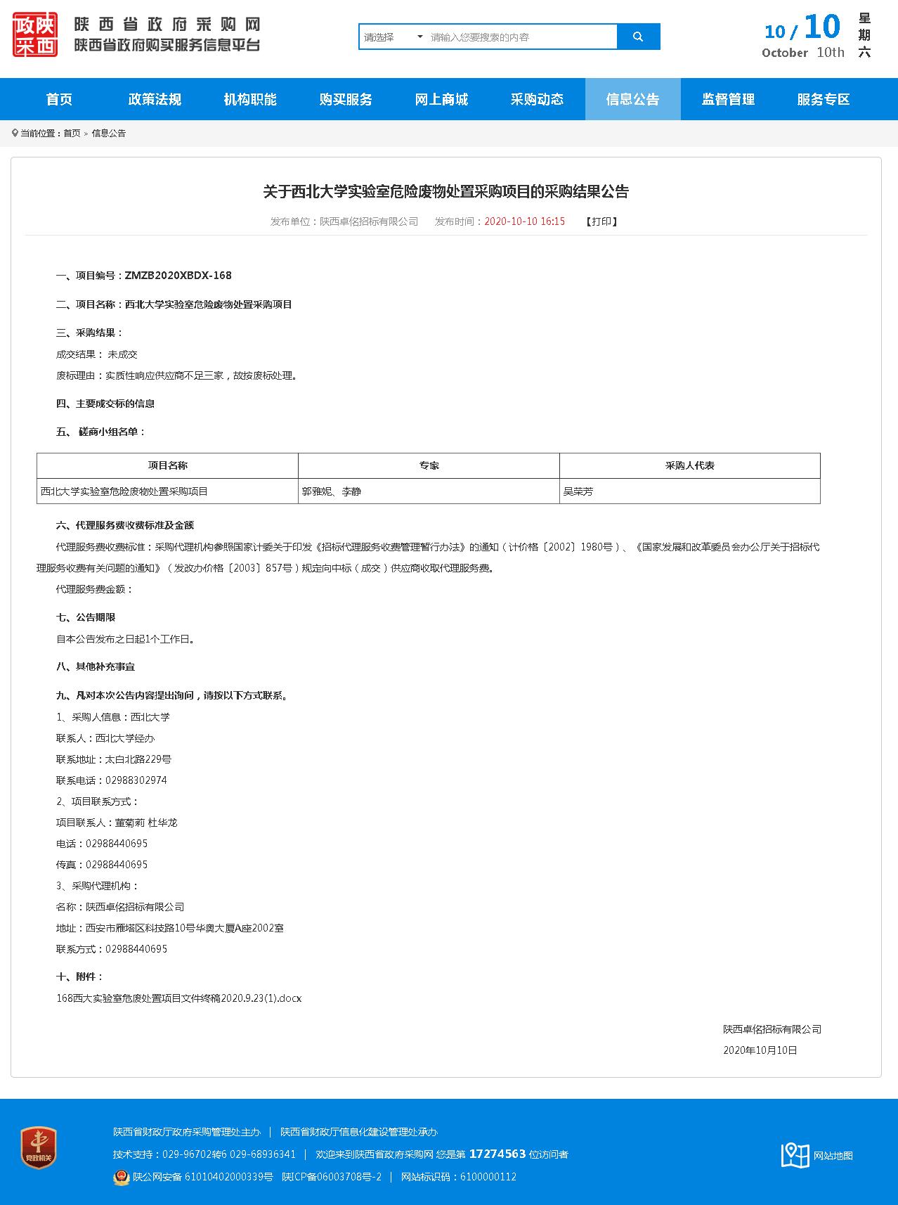 古天乐代言太阳集团城网址实验室危险废物处置采购项目的采购结果公告