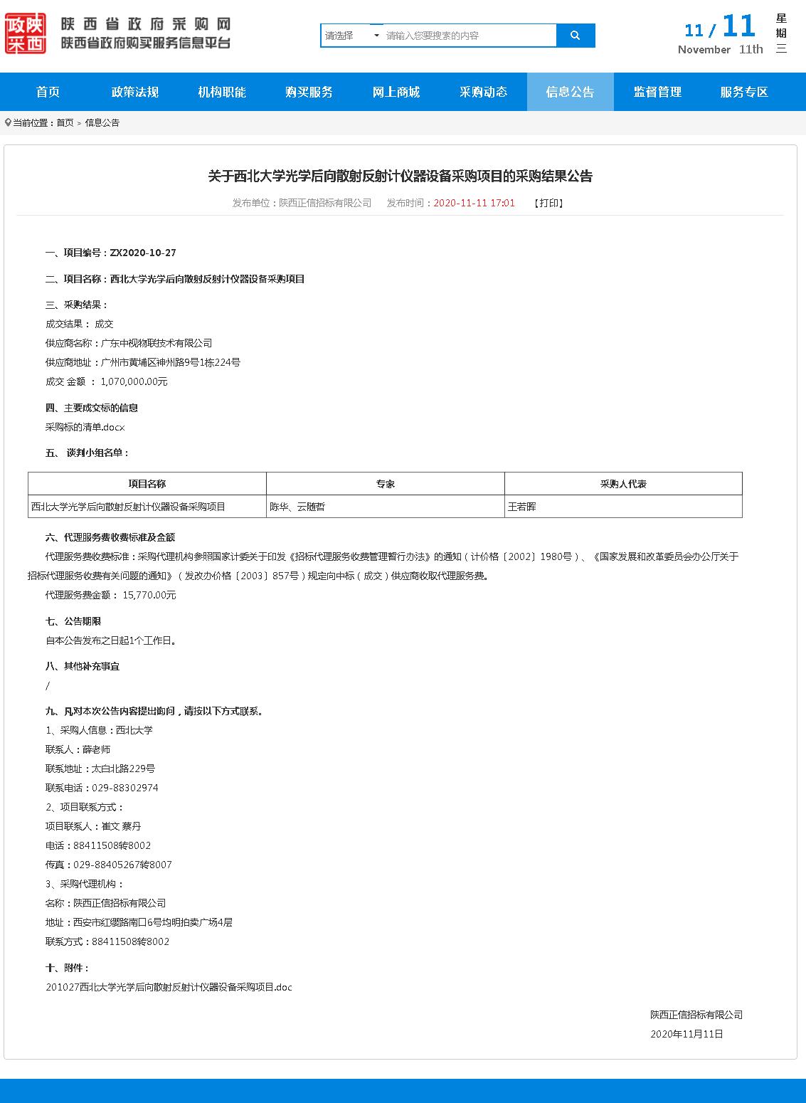 关于古天乐代言太阳集团城网址光学后向散射反射计仪器设备采购项目的采购结果公告