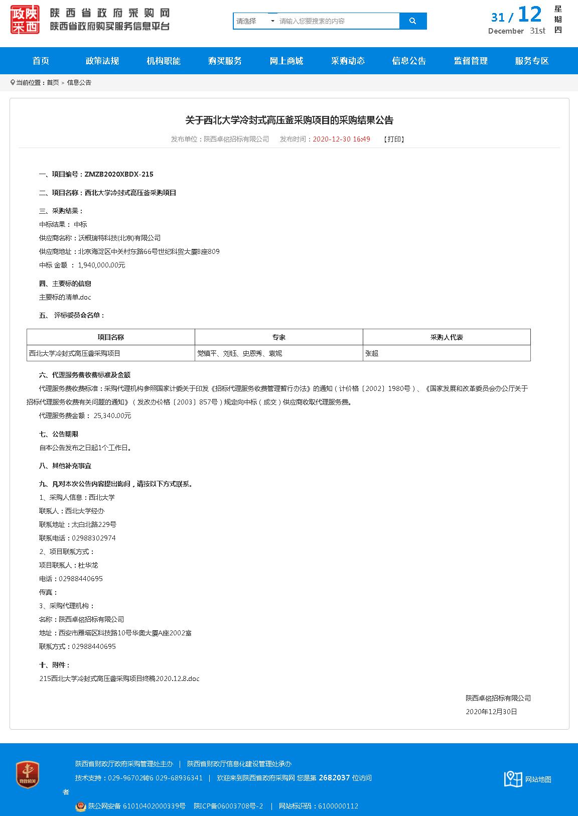 古天乐代言太阳集团城网址冷封式高压釜采购项目的采购结果公告