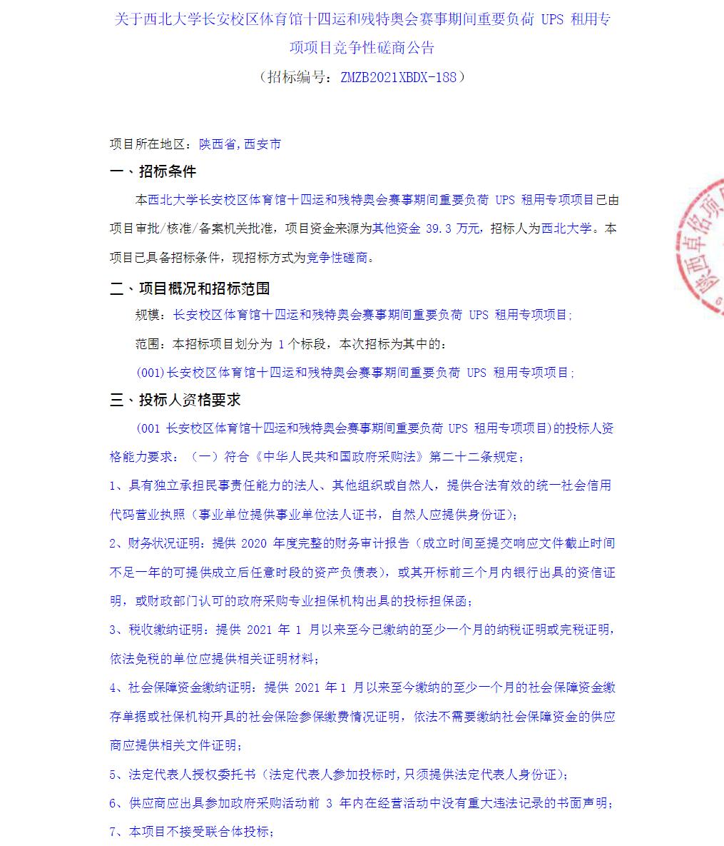 关于古天乐代言太阳集团城网址长安校区体育馆十四运和残特奥会赛事期间重要负荷UPS租用专项项目竞争性磋商公告