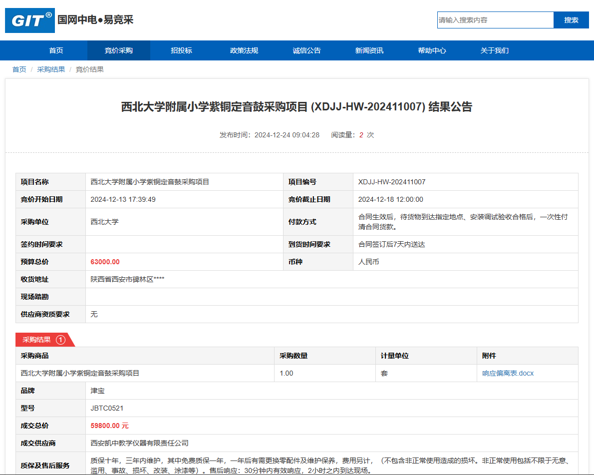 古天乐代言太阳集团城网址附属小学紫铜定音鼓采购项目(XDJJ-HW-202411007)竞价结果公告 作者:采购与招标办公室 编辑: 时间:2024-12-24 原公告链接:https://www.ejingcai.com.cn/site/bidding/detail/16145