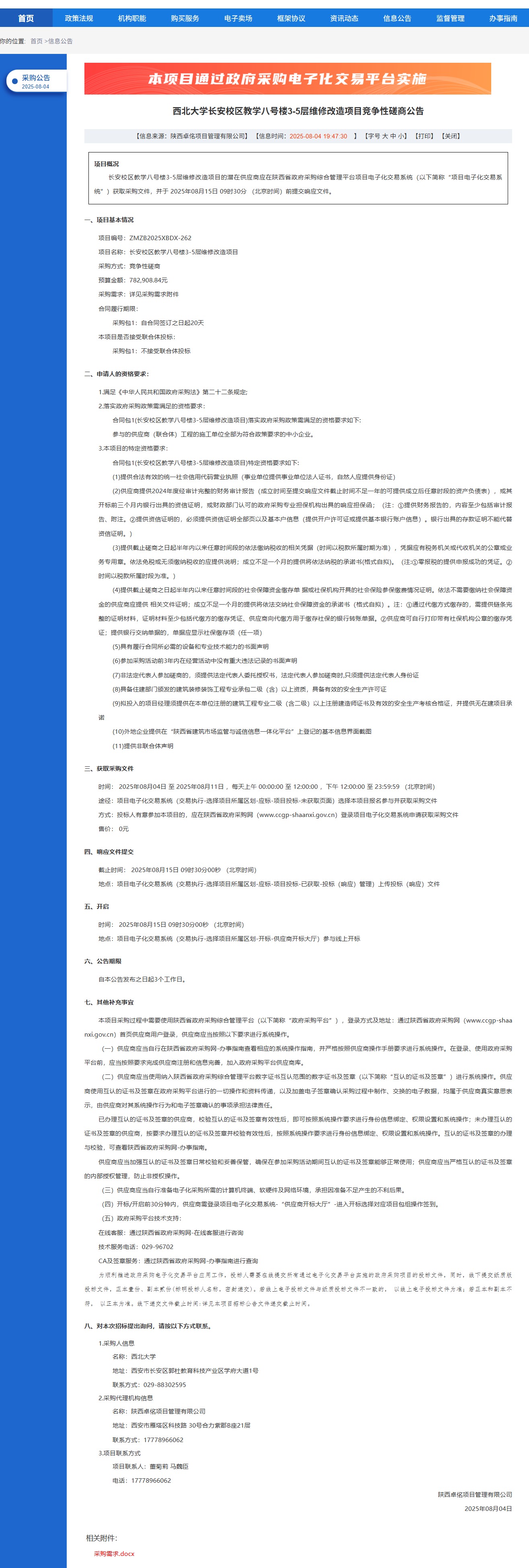 古天乐代言太阳集团城网址长安校区教学八号楼3-5层维修改造项目竞争性磋商公告 作者: 编辑:党丹珩 时间:2025-08-04 公告地址:https://www.ccgp-shaanxi.gov.cn/freecms/site/shaanxi/ggxx/info/2025/8a69c7f19860ef06019874dfc954016d.html?noticeType=001016¬iceId=d92bc43a-712a-11f0-8063-08c0eb20c666