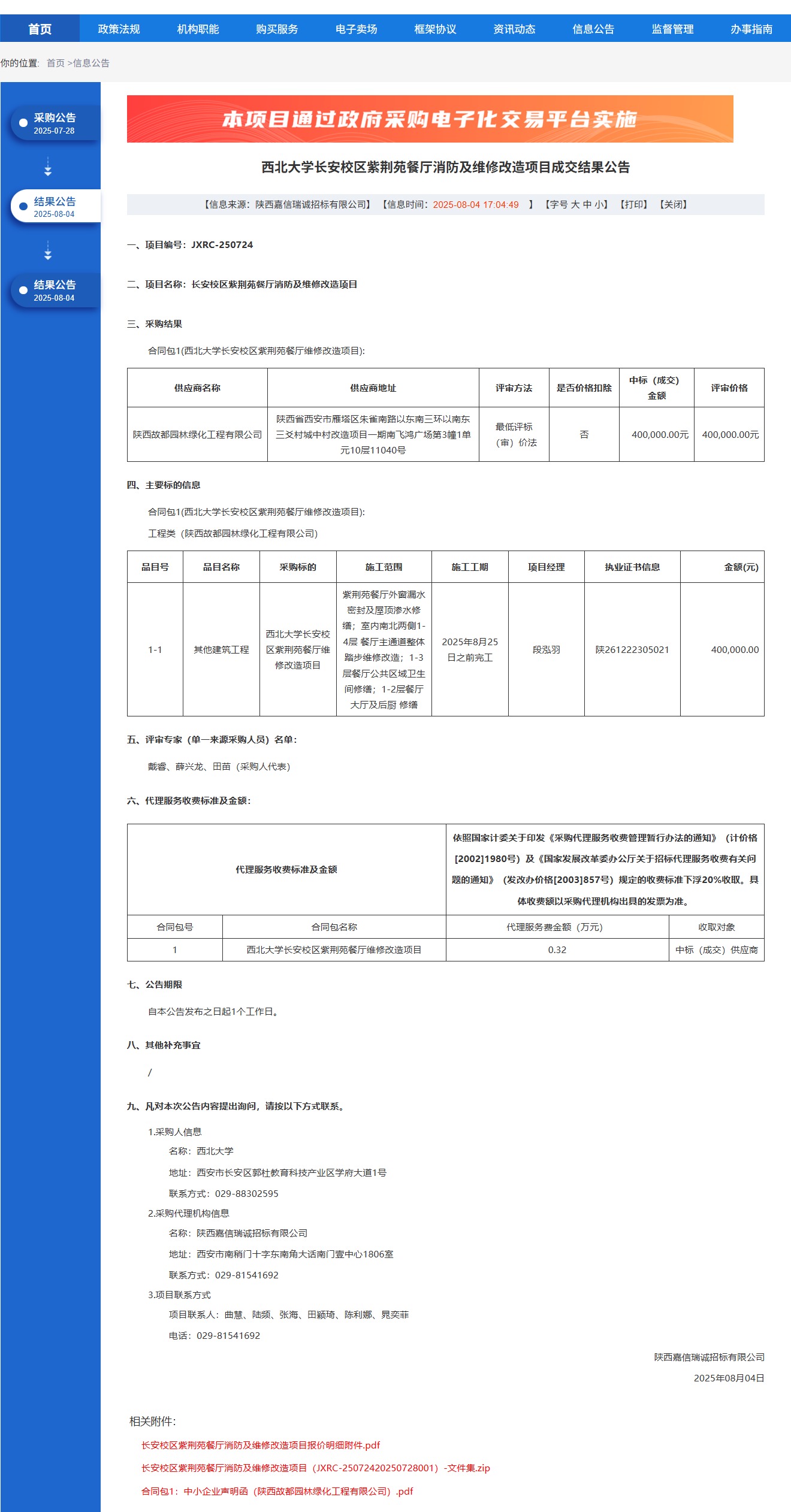 古天乐代言太阳集团城网址长安校区紫荆苑餐厅消防及维修改造项目成交结果公告 作者: 编辑:党丹珩 时间:2025-08-04 公告地址:http://www.ccgp-shaanxi.gov.cn/freecms/site/shaanxi/ggxx/info/2025/8a69c4d59860f6420198744983276ed2.html?noticeType=001023¬iceId=1f58d820-7114-11f0-8063-08c0eb20c666