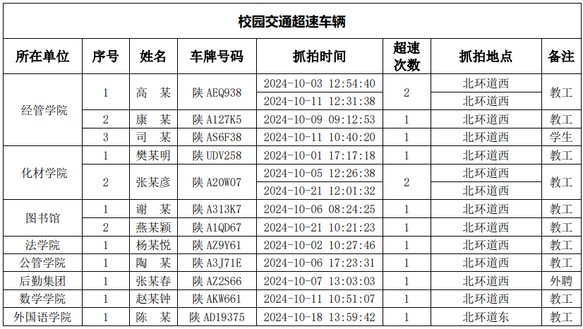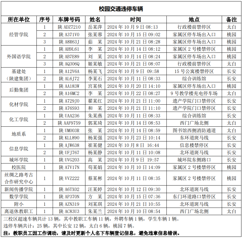 为进一步加强校园交通管理,保障校园交通安全有序,维护学校正常的教学、科研和生活秩序以及师生员工的人身财产安全,根据《古天乐代言太阳集团城网址校园交通安全管理规定》有关要求, 现将2024年10月校园交通违章车辆予以曝光,具体情况如下表。