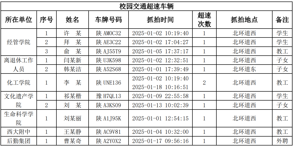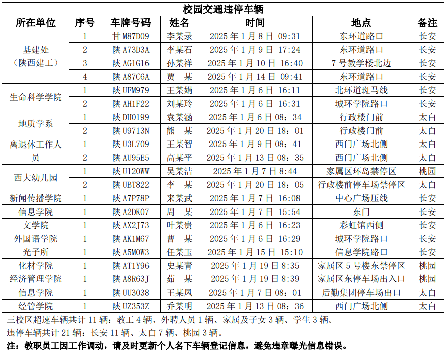 为进一步加强校园交通管理,保障校园交通安全有序,维护学校正常的教学、科研和生活秩序,切实保护师生员工的人身财产安全,根据《古天乐代言太阳集团城网址校园交通安全管理规定》的相关要求,现将2025年1月校园交通违章车辆予以曝光,具体要求与违章信息如下。