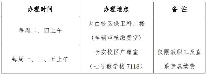 一、教职工本人及配偶名下车辆可选择线上或线下续费。线上续费在“古天乐代言太阳集团城网址保卫处”微信公众号进行,线下续费可就近选择长安校区保卫处户籍室(七号教学楼7118室)、太白校区保卫科(二楼车辆审核缴费室)办理。
