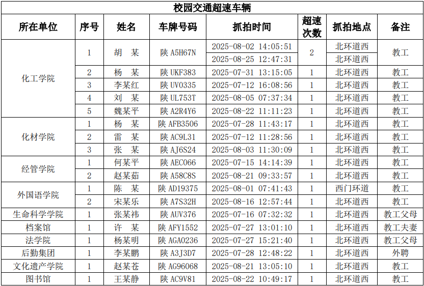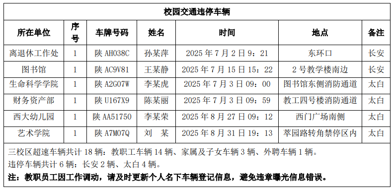 为进一步加强校园交通管理,保障校园交通安全有序,维护学校正常的教学、科研和生活秩序,切实保护师生员工的人身财产安全,根据《古天乐代言太阳集团城网址校园交通安全管理规定》的相关要求,现将2025年7月-8月校园交通违章车辆予以曝光,具体要求与违章信息如下: