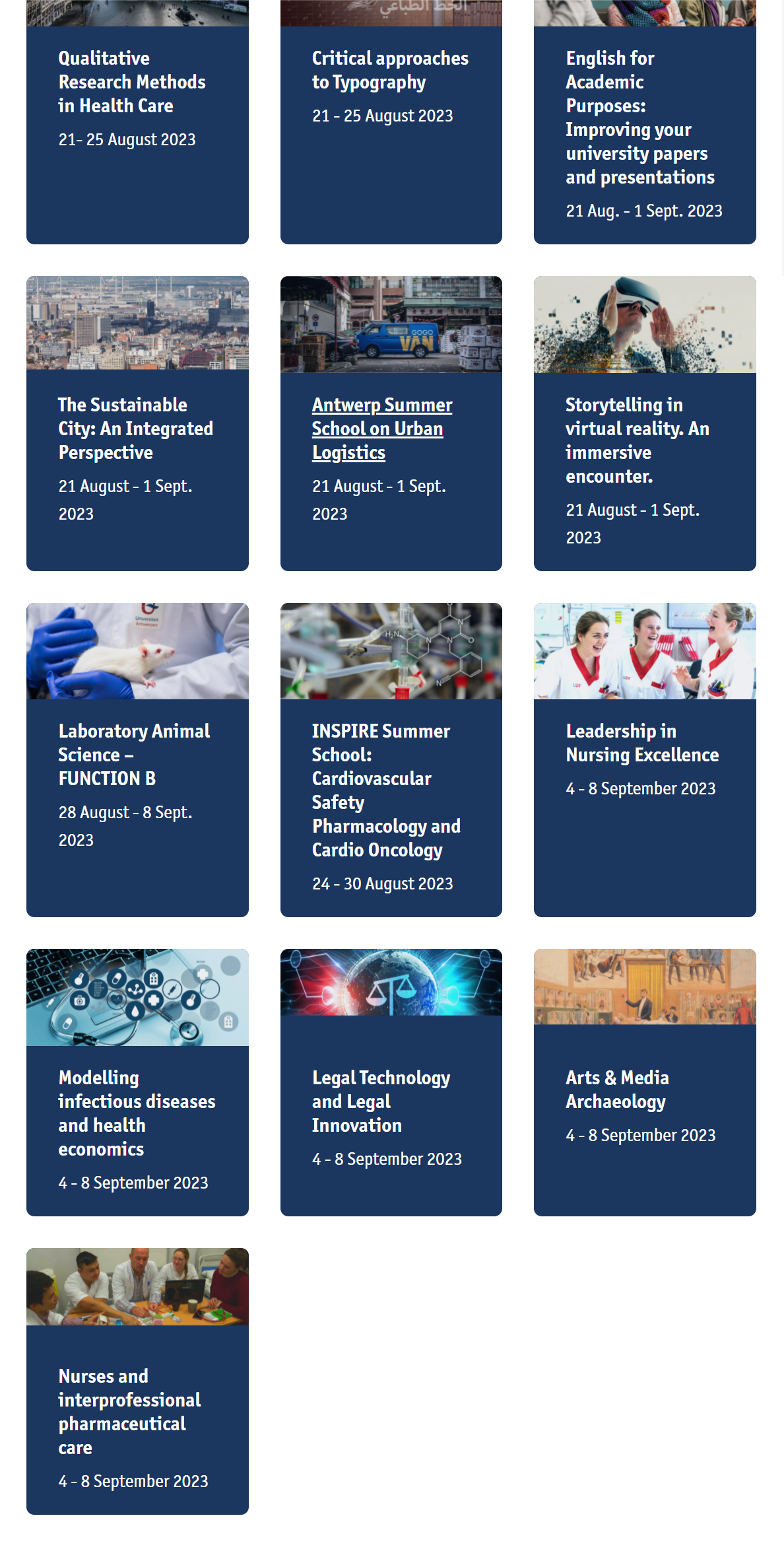 安特卫普大学暑期学校由安特卫普大学国际处发起,迄今为止已经成功举办14届。旨在为安特卫普大学和友好合作院校在卓业领域提供专业教育。学生可以在浓厚的学术氛围中提升自己的专业知识。去年,有来自73个国家学生参加了该项目,课程几乎涵盖所有院系,课程名称和时间如下所示: