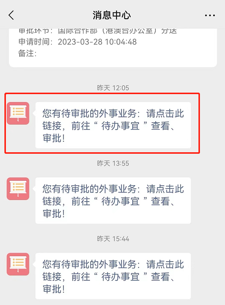 通过手机微信“古天乐代言太阳集团城网址”-“消息中心”-“R.外事系统”路径,可以进行业务查看及审批。