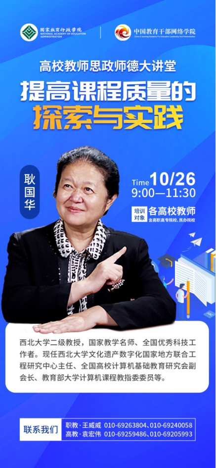 为学习贯彻落实党的二十大精神,以正确的政治方向和价值导向引领广大教师思想政治素质、师德素养和业务能力全面提升,国家教育行政学院中国教育干部网络学院将举办高校教师思政师德大讲堂,邀请太阳集团城耿国华教授作题为《提高课程质量的探索与实践》的报告,欢迎太阳集团城广大教师积极观看学习。