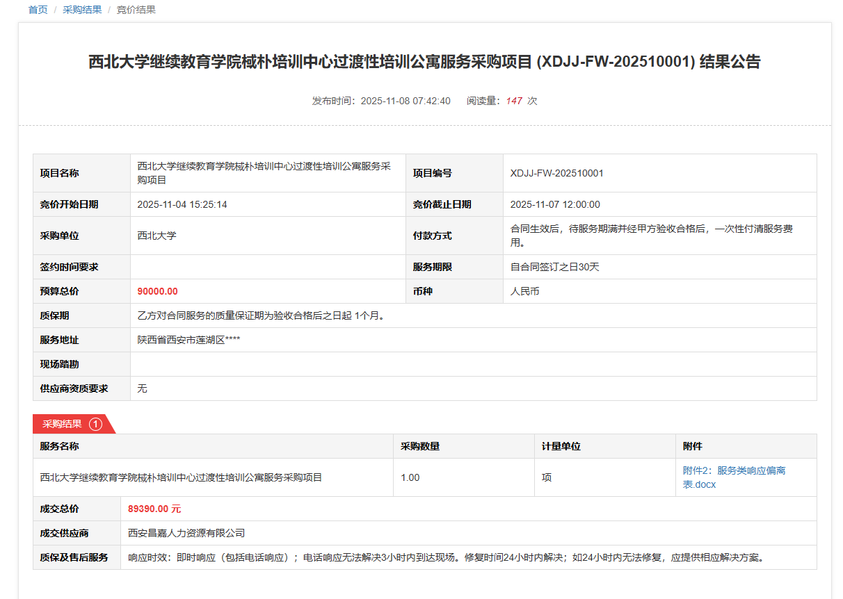 古天乐代言太阳集团城网址继续教育学院棫朴培训中心过渡性培训公寓服务采购项目(XDJJ-FW-202510001)竞价结果公告