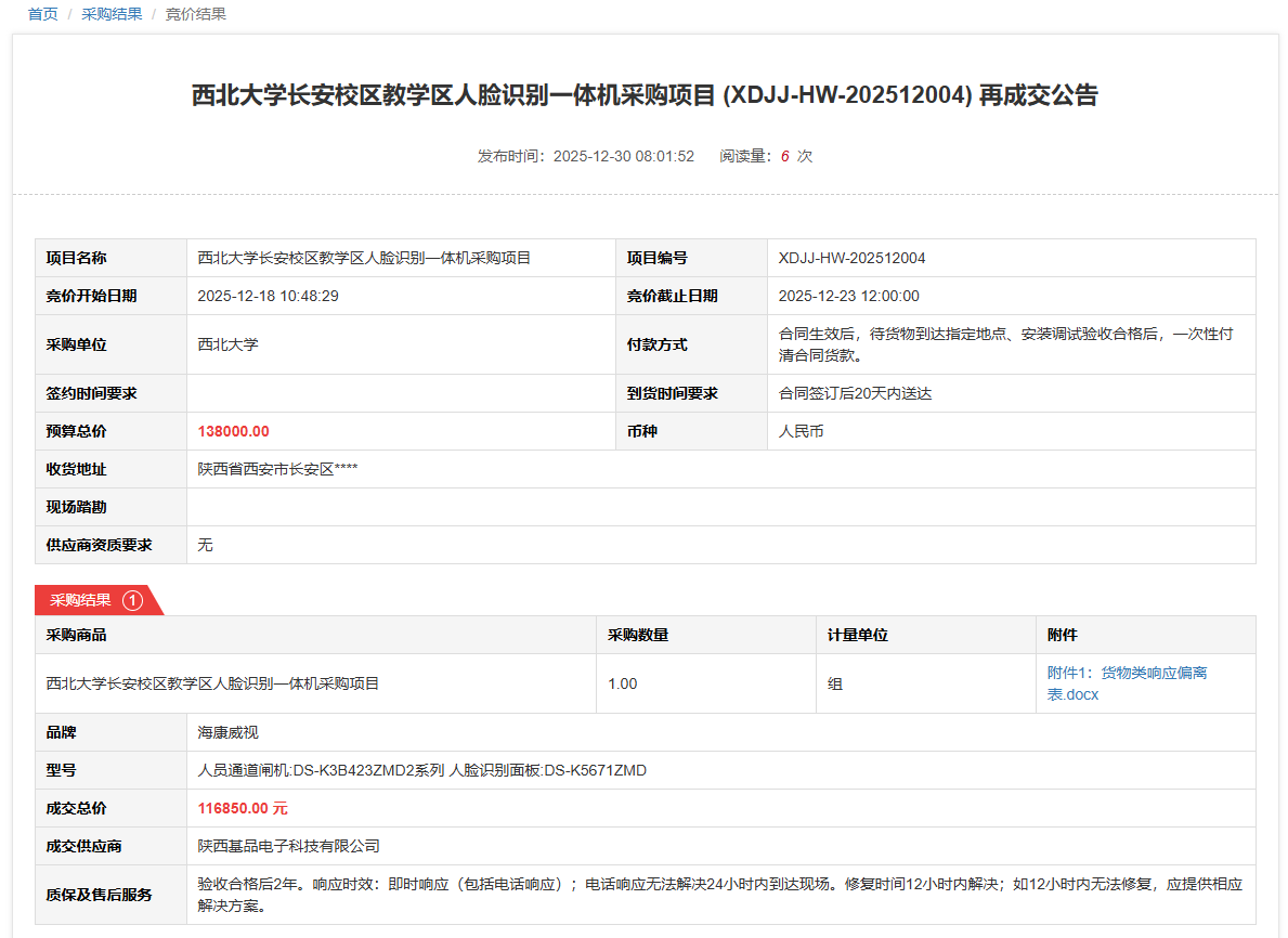 古天乐代言太阳集团城网址长安校区教学区人脸识别一体机采购项目(XDJJ-HW-202512004)竞价再成交公告
